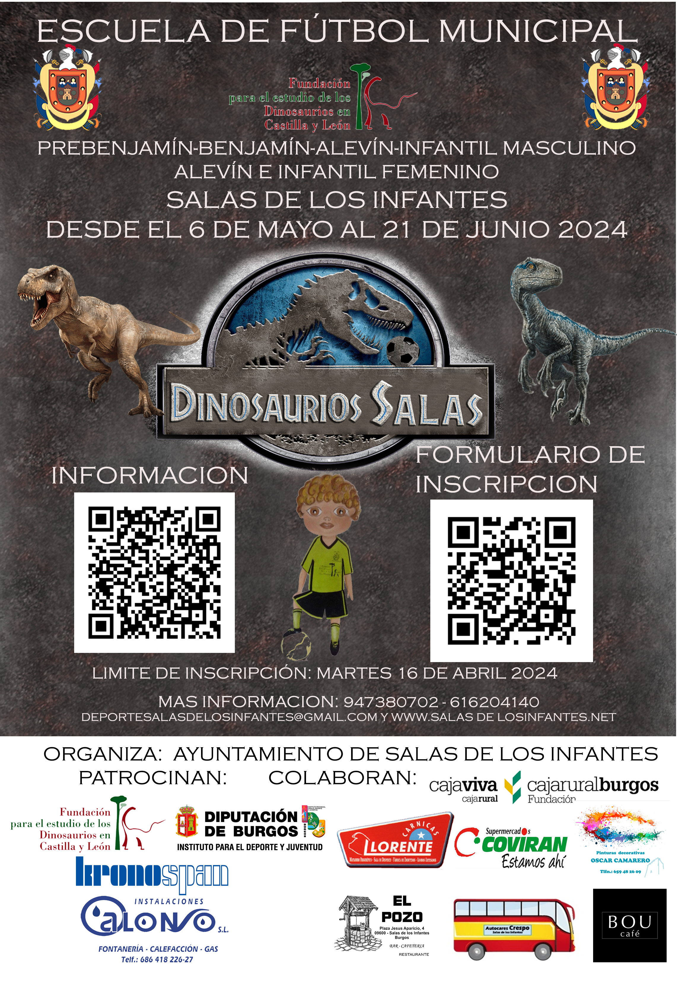 Desde el Viernes 12 al Martes 16 de abril del 2024 se abrirá el plazo de inscripción para la Escuela de Fútbol Municipal Fundación Dinosaurios CYL de Salas de los Infantes 2024 que vuelve en las categorías prebenjamín, benjamín, alevín e infantil masculino y alevín e infantil femenino.